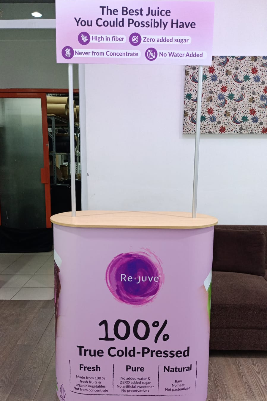 InnoGRAPH menghadirkan Portable Event Kit yaitu Pop Up Fabric sebagai backwall dan EasyCounter sebagai meja display. Kombinasi ini menjadikan booth disiapkan dengan cepat, ringkas dibawa, dan tetap memberikan tampilan visual yang rapi serta profesional untuk berbagai kebutuhan promosi.